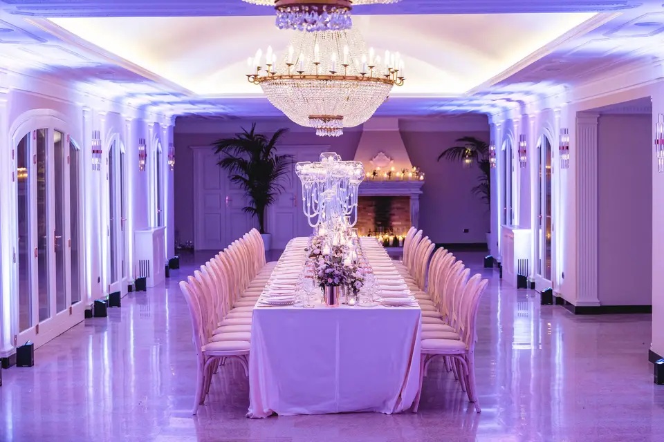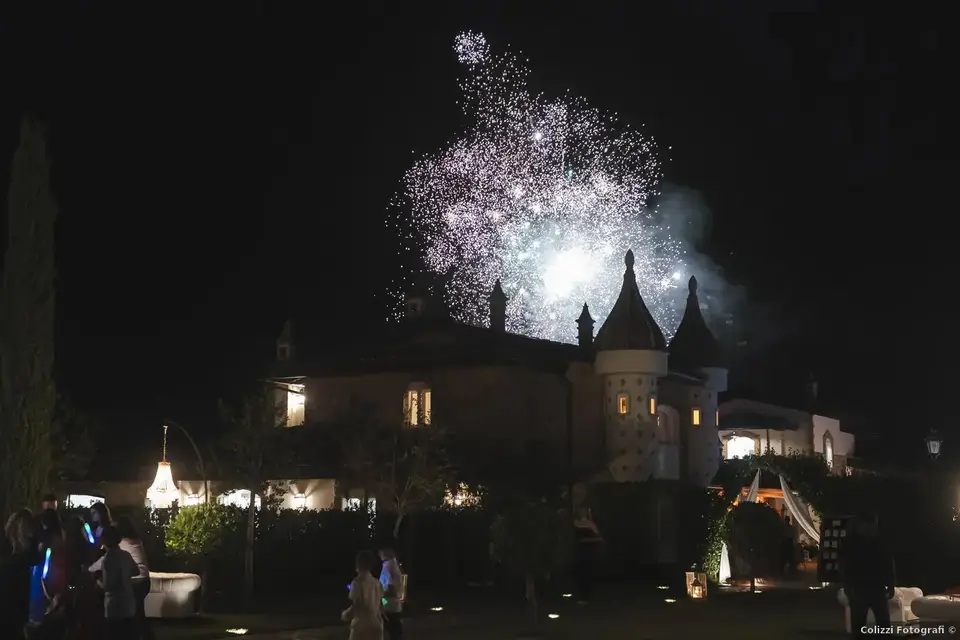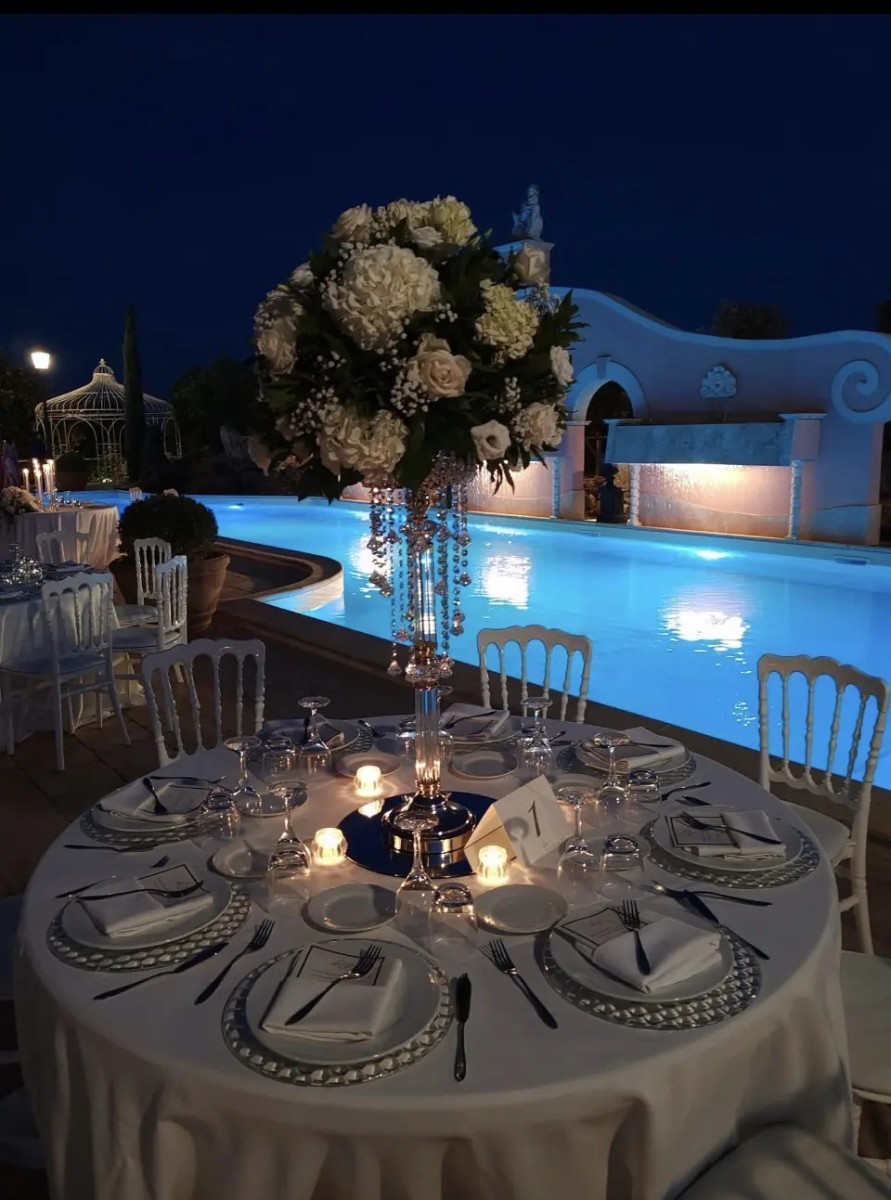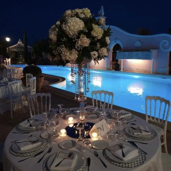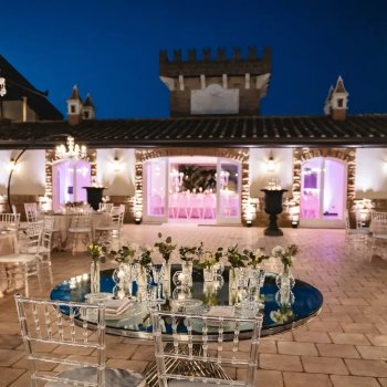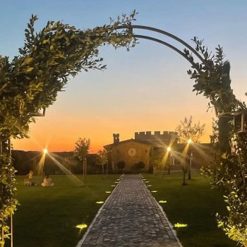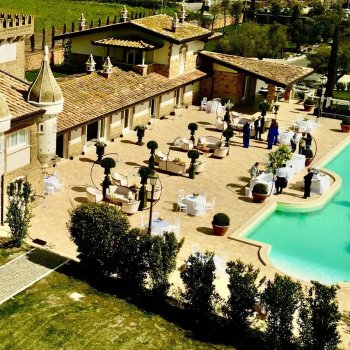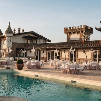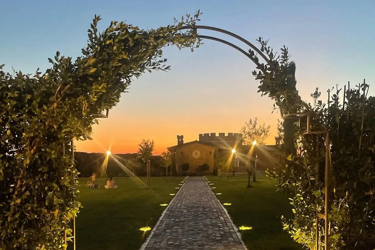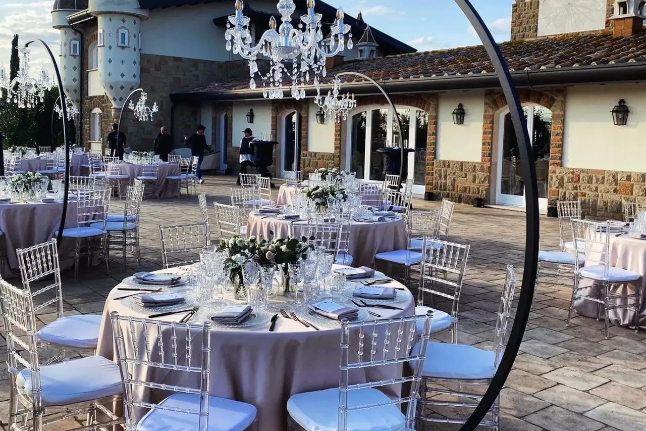 La struttura comprende due sale ricevimento indipendenti — la Sala del Castello, fino a 250 ospiti, e la Villa di Bacco, fino a 140 — distanti appena cinquanta metri e pensate per eventi di diversa scala. Completano gli spazi una piscina con area cocktail, una suite nuziale per la preparazione e il pernottamento degli sposi, sei camere per gli ospiti e un parcheggio privato.