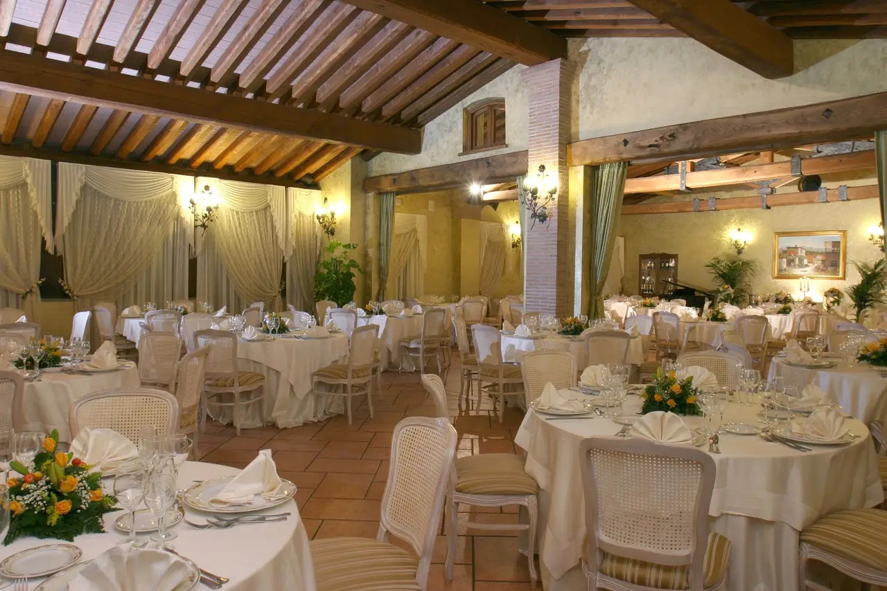 Il casale dispone di più sale interne di carattere diverso, una terrazza e un giardino con area archeologica visibile, dove si svolge il gran buffet degli antipasti con show cooking dal vivo. La cucina è tradizionale romana, interamente prodotta in casa: pasta fresca, pane artigianale, mozzarella tirata a vista, pesce fresco e formaggi del norcino. I menù sono personalizzabili senza numero minimo di ospiti garantito — una flessibilità rara a Roma — e includono opzioni per vegetariani, vegani e celiaci. Capienza fino a 300 ospiti, nessun limite orario.