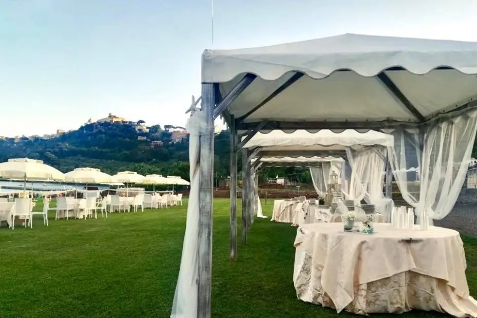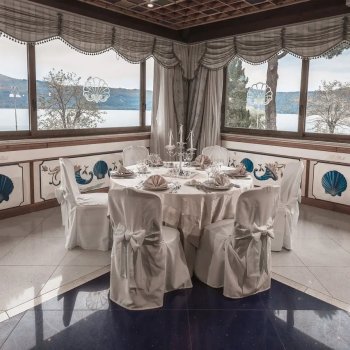 Ciò che rende questa location unica è la sua posizione: si entra dalla Via della Spiaggia del Lago e il panorama lacustre accompagna ogni momento della giornata. Chi lo desidera può celebrare il rito civile direttamente in riva all'acqua, poi spostarsi per l'aperitivo all'aperto e concludere la sera nella Sala Zaffiro — elegante, raffinata, capace di accogliere fino a 250 ospiti — o nella Sala Cristallo con il soffitto in legno e le vetrate panoramiche sul lago.