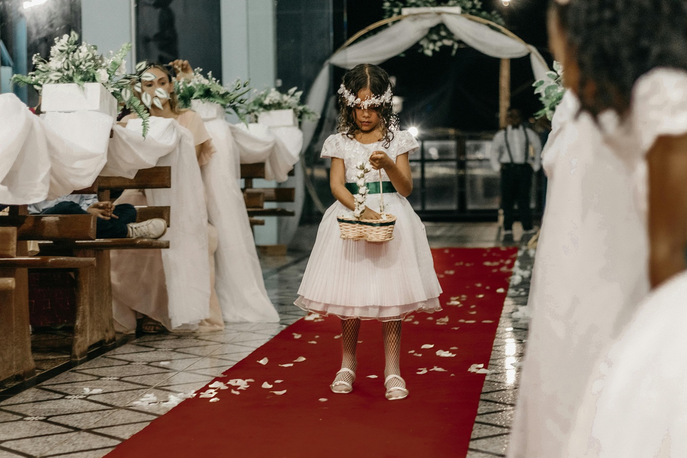 La damigella bambina (flower girl) sparge petali o porta un fiore; il paggetto porta le fedi o annuncia la sposa.